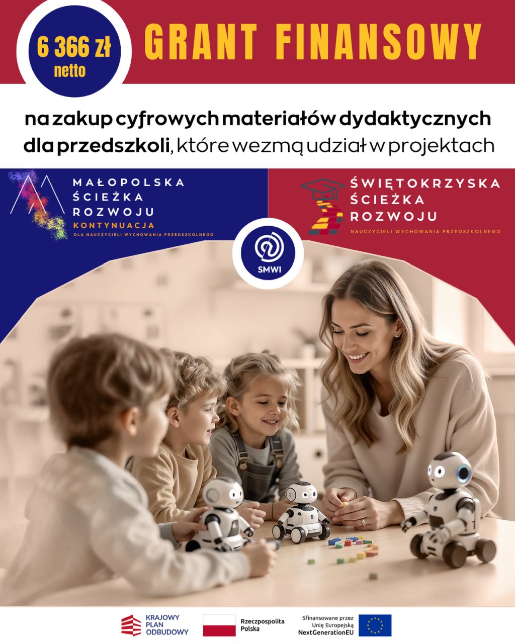 „Małopolska Ścieżka Rozwoju - Kontynuacja dla Nauczycieli Wychowania Przedszkolnego” oraz „Świętokrzyska Ścieżka Rozwoju Nauczycieli Wychowania Przedszkolnego”. Projekty są finansowane ze środków Krajowego Planu Odbudowy i Zwiększania Odporności (KPO).