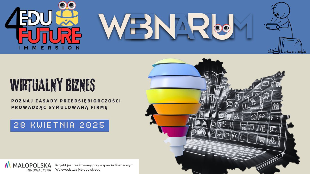 Zapraszamy do udziału w webinarium - organizowanym w ramach projektu Edu4Future Immersion - którego celem jest przekazanie uczestnikom kluczowych zasad prowadzenia własnego biznesu oraz przedstawienie potencjału symulacji biznesowych jako narzędzia wspierającego rozwój własnej firmy. Webinarium odbędzie się 28 kwietnia 2025 r. na platformie Teams, w godzinach od 9.00 do 10.30.